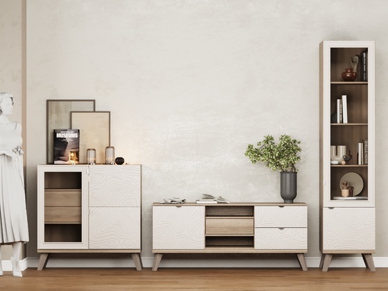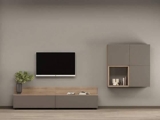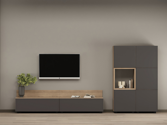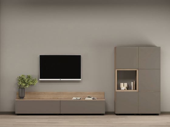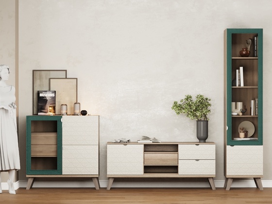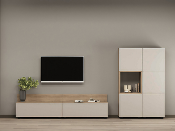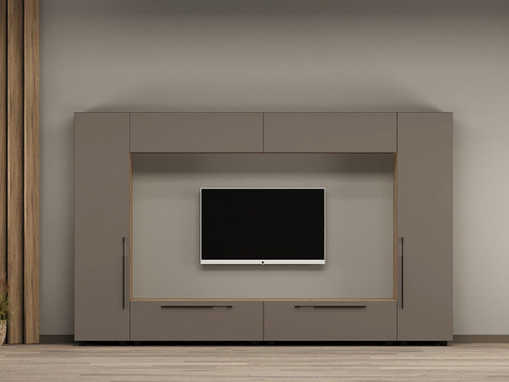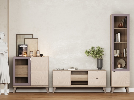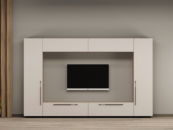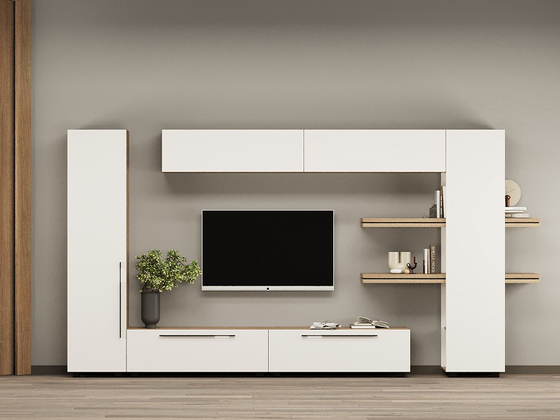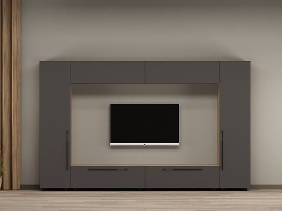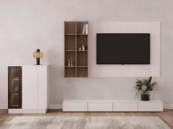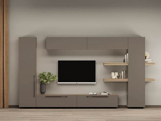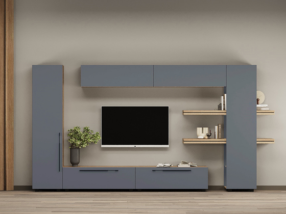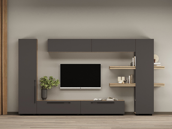 - Функциональность. Ниши под ТВ, закрытые шкафы, витрины и полки позволяют рационально использовать пространство, а для более вместительных решений можно рассмотреть гостиные со шкафом.