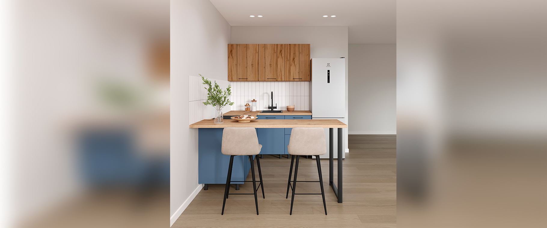 Компактная планировка с барной стойкой идеально подходит для небольших квартир: она не только экономит место, но и создаёт уютную зону для завтраков или неформальных встреч. Отдельно стоящий холодильник органично вписывается в интерьер, не перегружая пространство.