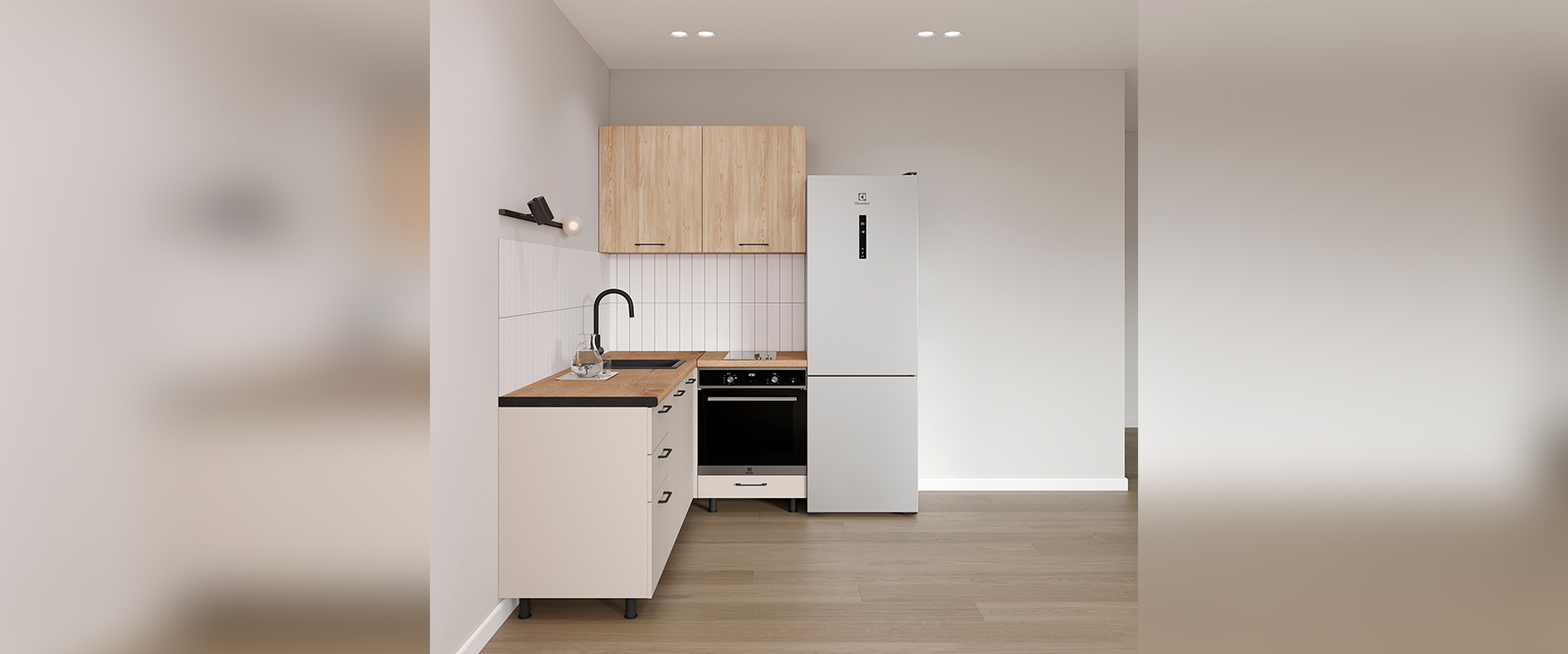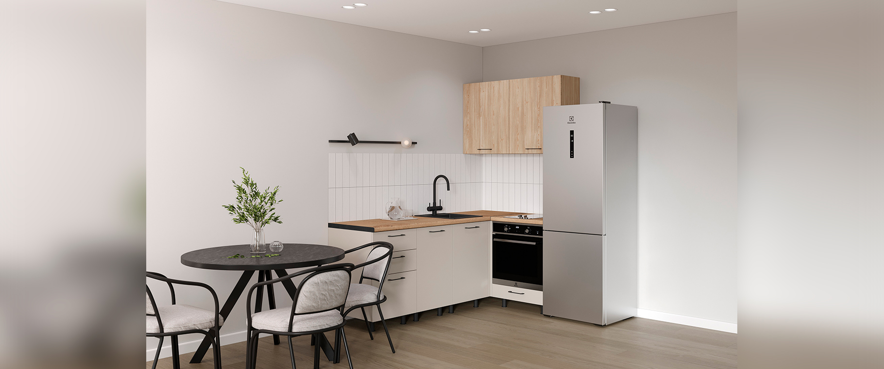 Компактная угловая планировка идеально подходит для небольших квартир: она не только экономит место, но и создаёт уютную зону для завтраков или неформальных встреч. Отдельно стоящий холодильник органично вписывается в интерьер, не перегружая пространство.