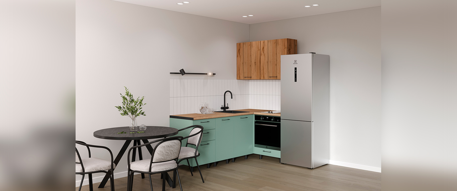 Компактная угловая планировка идеально подходит для небольших квартир: она не только экономит место, но и создаёт уютную зону для завтраков или неформальных встреч. Отдельно стоящий холодильник органично вписывается в интерьер, не перегружая пространство.