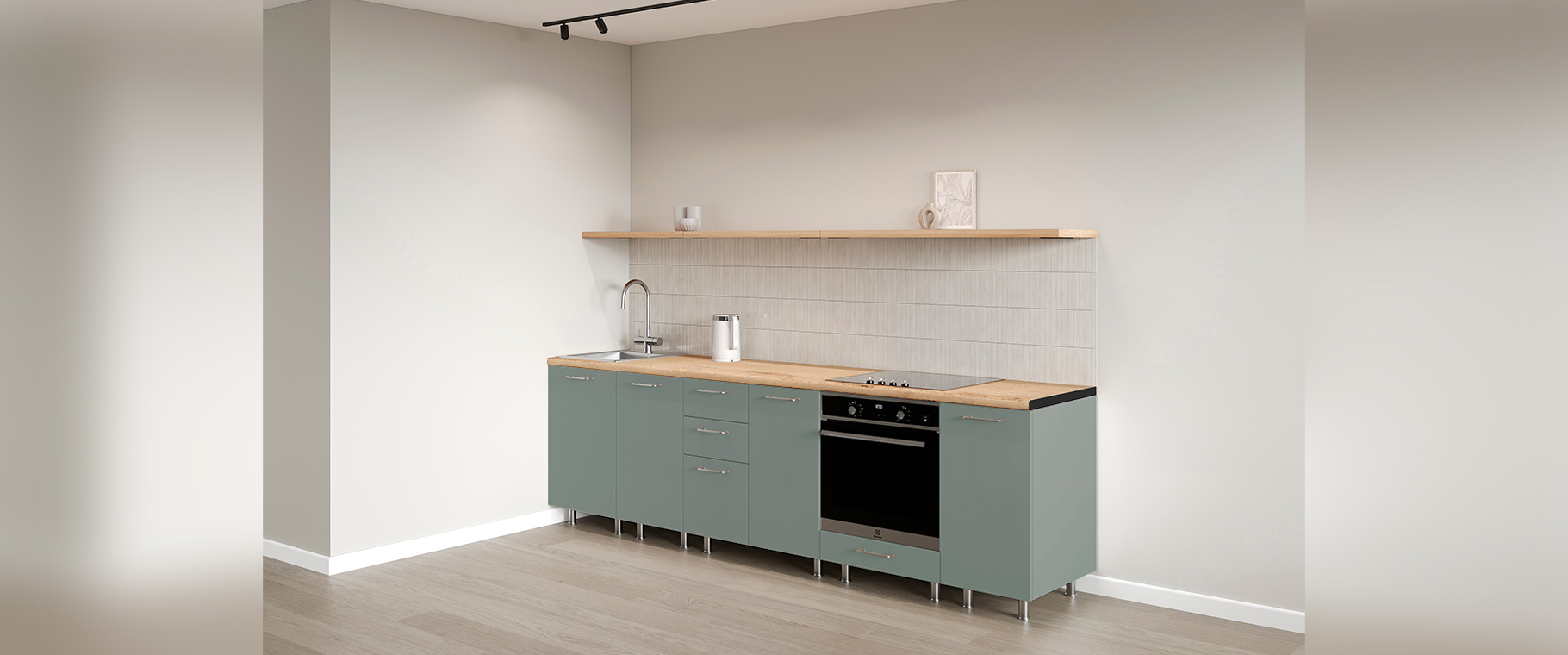 Кухня прекрасно подходит для небольших квартир или как основа для будущих обновлений. Несмотря на отсутствие верхних шкафов, гарнитур включает в себя вместительные нижние модули с выдвижными ящиками и распашными дверцами для хранения посуды и кухонной утвари. Благодаря открытой полке пространство кухни кажется более просторным, рационально организованным и без лишних деталей. Кухня сочетает в себе надежность, элегантность и доступную цену.