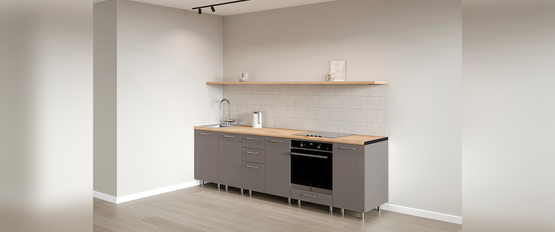 Кухня прекрасно подходит для небольших квартир или как основа для будущих обновлений. Несмотря на отсутствие верхних шкафов, гарнитур включает в себя вместительные нижние модули с выдвижными ящиками и распашными дверцами для хранения посуды и кухонной утвари. Благодаря открытой полке пространство кухни кажется более просторным, рационально организованным и без лишних деталей. Кухня сочетает в себе надежность, элегантность и доступную цену.