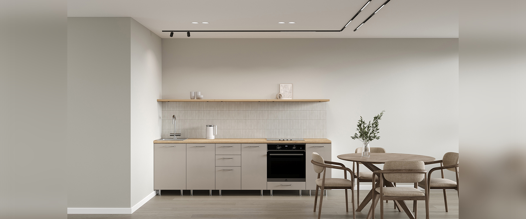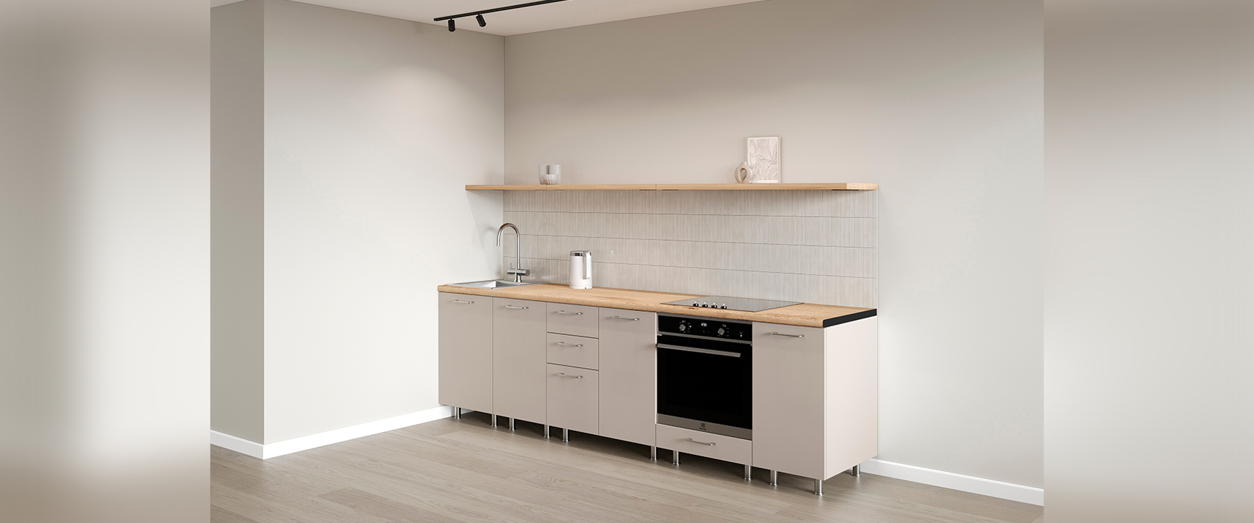 Кухня прекрасно подходит для небольших квартир или как основа для будущих обновлений. Несмотря на отсутствие верхних шкафов, гарнитур включает в себя вместительные нижние модули с выдвижными ящиками и распашными дверцами для хранения посуды и кухонной утвари. Благодаря открытой полке пространство кухни кажется более просторным, рационально организованным и без лишних деталей. Кухня сочетает в себе надежность, элегантность и доступную цену.